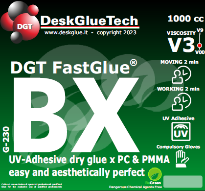 Hybridization occurs because the glue is composed of both solvent and polymerizing agents that are reactive to environmental UV so that the advantages of both solutions are obtained. That is fast glue, simple to use but with excellent aesthetic features both of the gluing line and of the glue edge line. Use capillary without pressure. Ideal for bonding at 90° (cut both 90° but better 89°) XT material thicknesses from 2 to 10 mm. Also suitable for use on Cast sheets but with a lower resistance. Suitable for bubble-free laminations, and for 45° bonding ( better cut at 44.5 )
